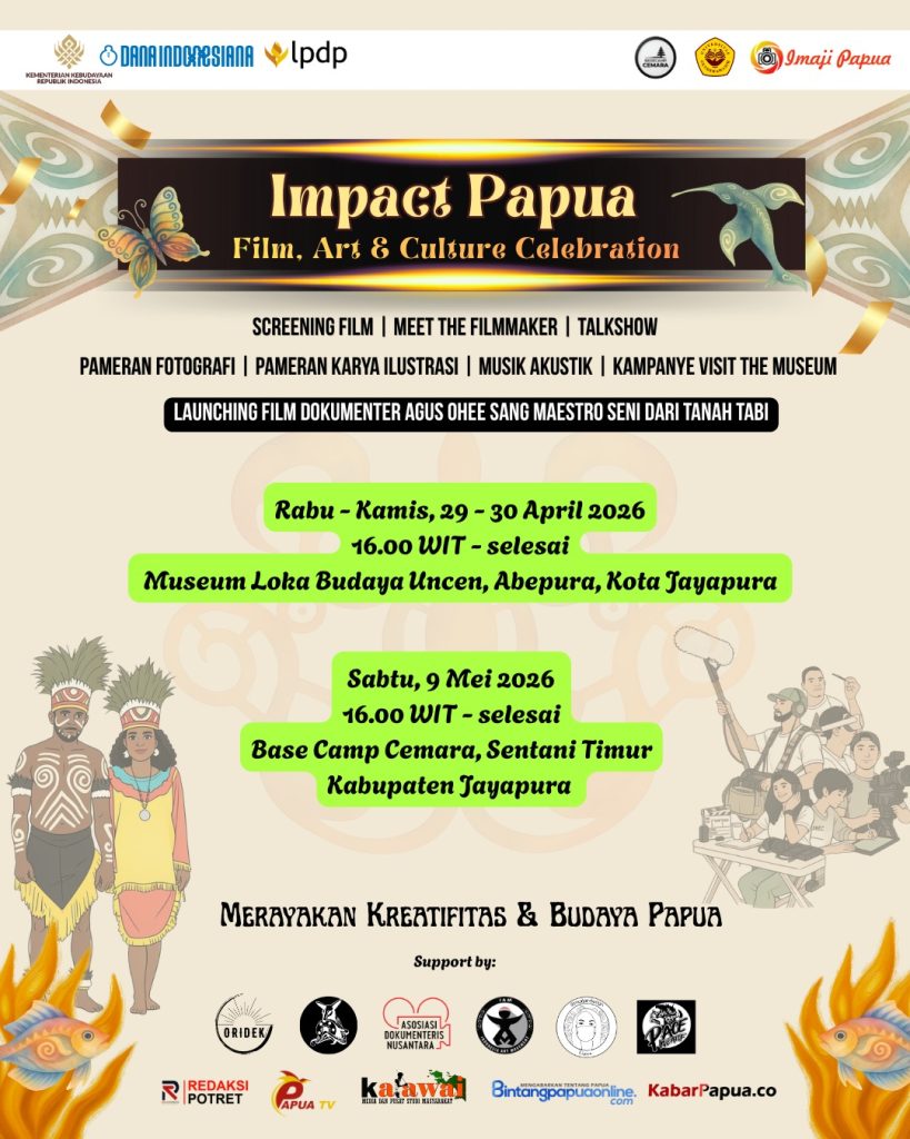 Impact Papua: Film, Art & Culture Celebration akan diselenggarakan di dua titik, yakni tanggal 29-30 April 2026 di Museum Loka Budaya Uncen Abepura, Kota Jayapura dan tanggal 9 Mei 2026 di Basecamp Cemara, Sentani Timur, Kabupaten Jayapura. ***(Rls)