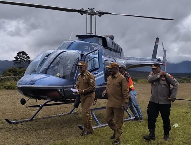 Bupati dan Wakil Bupati Puncak mengantar dana desa langsung kepada masyarakat di distrik terjauh dengan menggunakan helikopter. Foto: Diskominfo Puncak