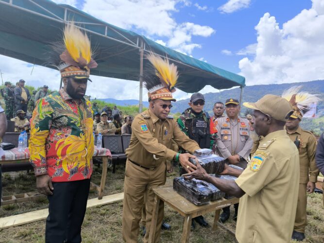 KABARPAPUA.CO, Ilaga- Bupati Puncak Elvis Tabuni bersama dengan Wakil Bupati Puncak Naftali Akawal dengan menggunakan helikopter mengantar langsung dana desa ke Distrik Oneri, Lambewi, Agandugume. Penyerahan dana ini dipusatkan di Distrik Agandugume, Senin, 21 Juli 2025.