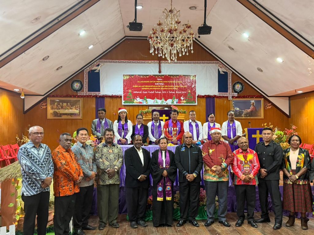 Ibadah Natal di Gereja Kristen Injili (GKI) Jemaat Eklesia, Ilaga, dipimpin oleh Ketua Jemaat, Pdt. Lea P. Rumayau S.Si, mengusung tema “Allah Hadir Untuk Menyelamatkan Keluarga.”