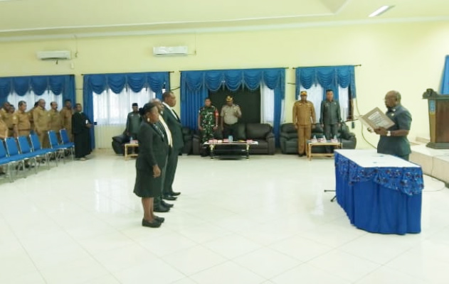 Bupati Jayapura, Dr. Yunus Wonda, SH, MH saat melantik tiga pejabat eselon II, di Aula Lantai II Kantor Bupati. (Foto dok: jayapurakab.go.id)