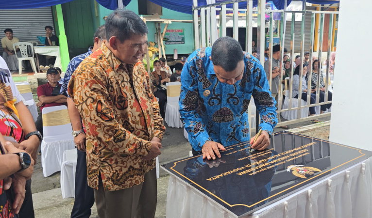 Bupati Kepulauan Benyamin Arisoy saat menandatangani plakat Gedung Asrama di Yogyakarta. (Foto dok: Humas Pemda Kepulauan Yapen)