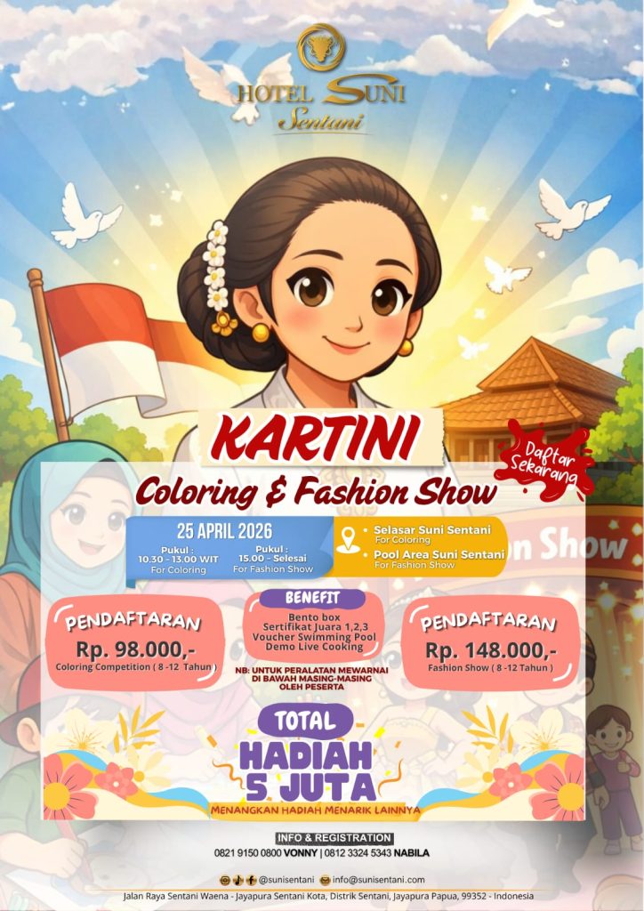 KABARPAPUA.CO, Sentani– Hotel Suni Sentani siap menggelar rangkaian acara meriah bertajuk “Emansipasi dan Kreativitas Anak Bangsa”. Hotel berbintang ini menghadirkan lomba coloring (mewarnai) dan fashion show anak dengan total hadiah mencapai Rp5 juta.