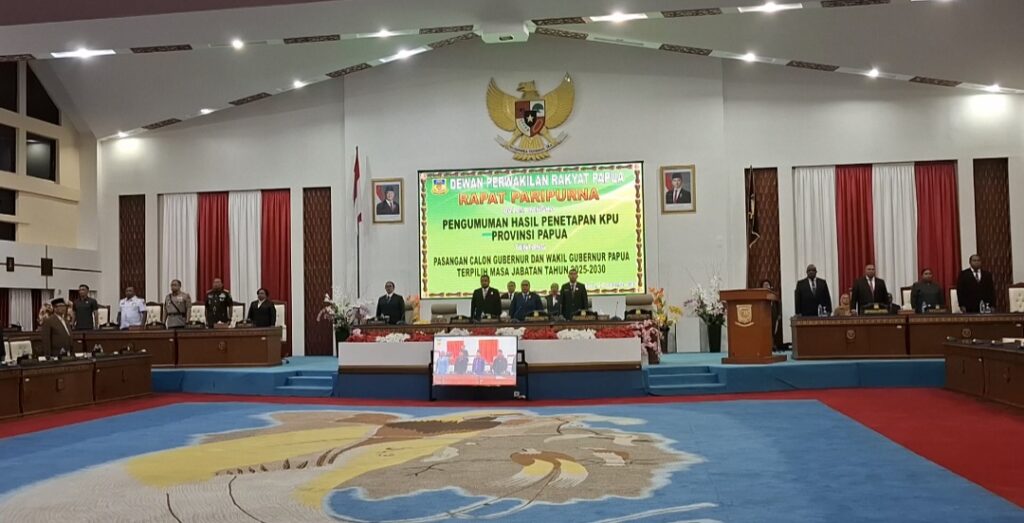 KABARPAPUA.CO, Kota Jayapura– Dewan Perwakilan Rakyat (DPR) Papua menggelar rapat paripurna penetapan pasangan Matius D. Fakhiri – Aryoko Rumaropen ( Mari-Yo) sebagai Gubernur dan Wakil Gubernur Papua 2025-2030 dengan perolehan suara 259.817 suara atau 50,4 persen dari total suara sah.