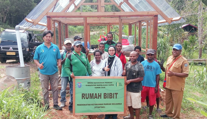 Dinas Ketahanan Pangan Kepulauan Yapen bersama masyarakat empat kampung di Ambaidiru berfoto di depan Rumah Bibit yang baru diserahkan. (Foto dok: Dinas Ketahanan Pangan Kepuluan Yapen)