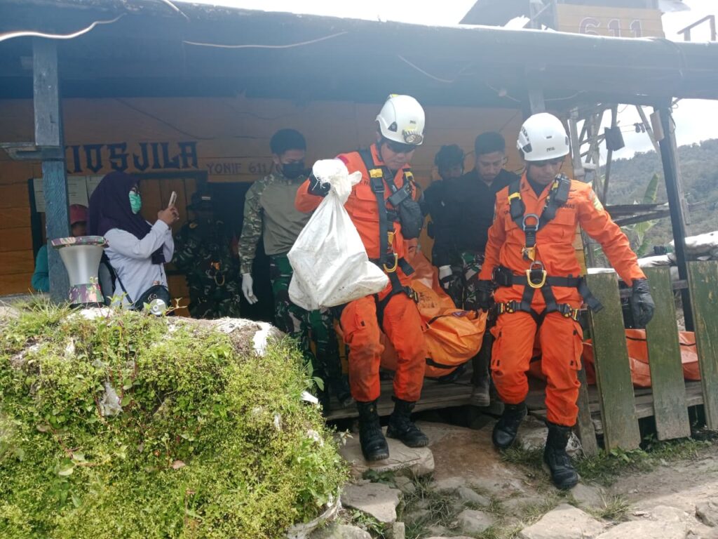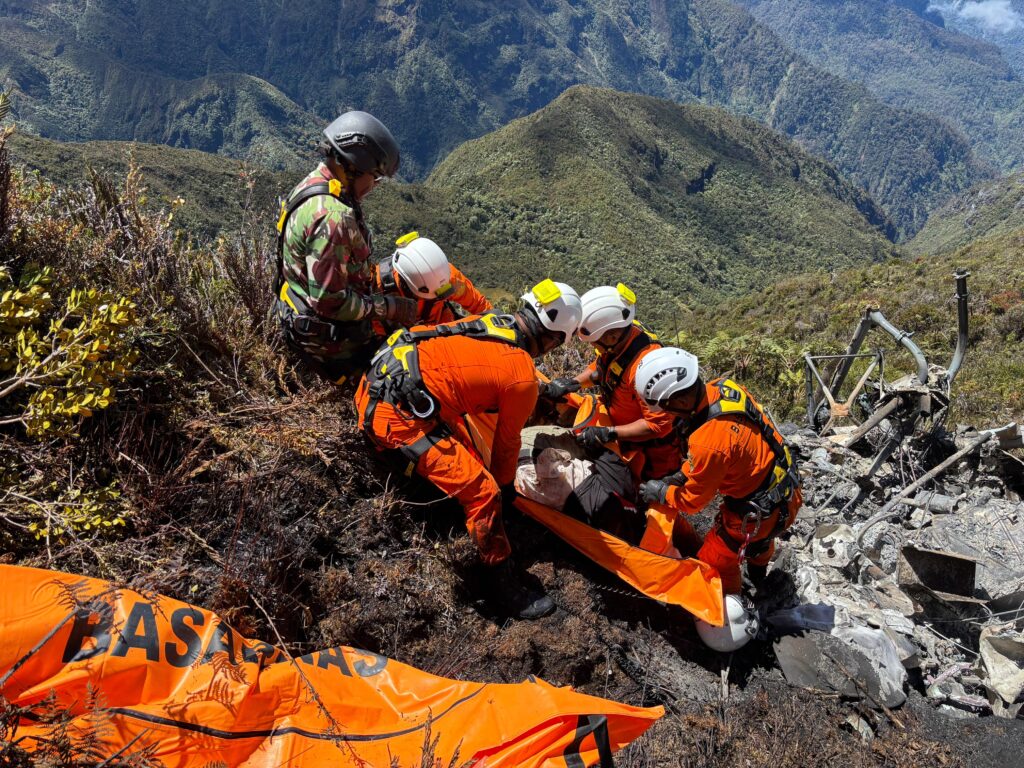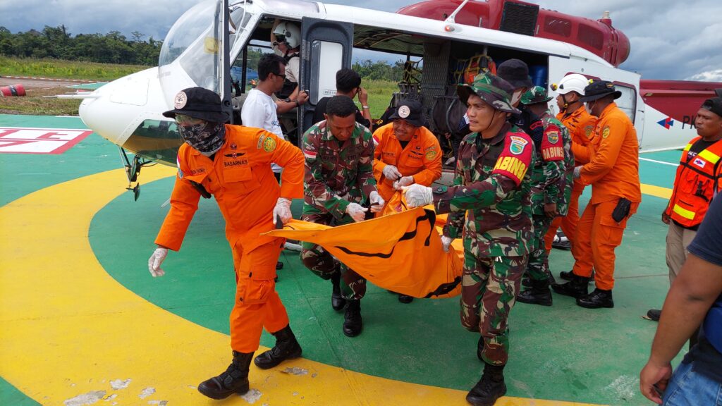 Tim SAR Timika evakuasi 4 jenazah penumpang helikopter PK IWS di Jila. Helikopter jatuh di antara Ilaga dan Jila pada Rabu 10 September 2025. Foto: SAR Timika