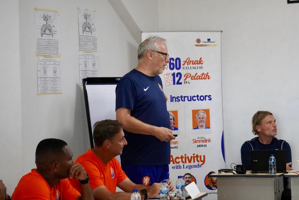 Pelatih dari KNVB Andre Simmelink memberikan sesi teori strategi sepak bola dalam sesi kursus kepada pelatih PFA. Foto: PTFI