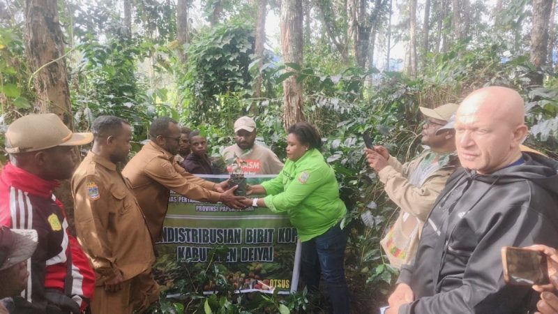 KABARPAPUA.CO, Deiyai– Pemerintah Provinsi (Pemprov) Papua Tengah menunjukkan komitmen nyata dalam mensejahterakan petani kopi. Gubernur Papua Tengah, Meki Nawipa menghibahkan 6.400 bibit pohon Kopi Arabika kepada warga Kabupaten Deiyai untuk pengembangan usaha pertanian.