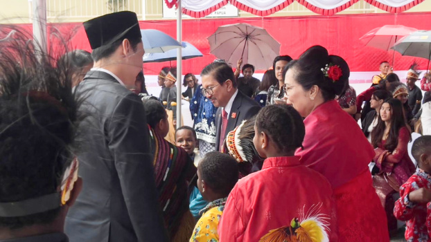Terlihat Tony ditemani istri tercinta Rosita Manik dan rombongan tamu, serta jajaran petinggi PTFI, harus menggunakan payung, agar pakaian mereka tak basah kuyub. “Saya memang sengaja mengkhususkan diri untuk datang ke sini (Asrama Tomawin),” kata Tony.