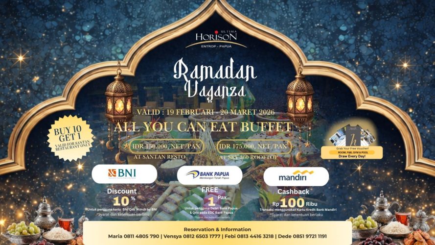 KABARPAPUA.CO,Kota Jayapura-  Horison Ultima Entrop Papua menghadirkan promo spesial bertajuk “Ramadhan Vaganza – All You Can Eat Iftar Buffet”, sebuah pengalaman berbuka puasa yang menghadirkan beragam hidangan lezat dengan suasana hangat dan penuh kebersamaan.