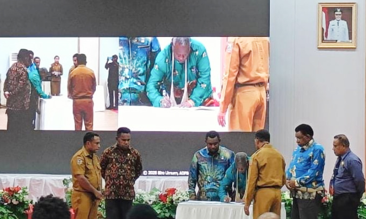 Saat penandatangan 13 rekomendasi hasil Raker Asosisasi MRP se-Tanah Papua yang digelar di Nabire, Papua Tengah. (KabarPapua.co/Vero)