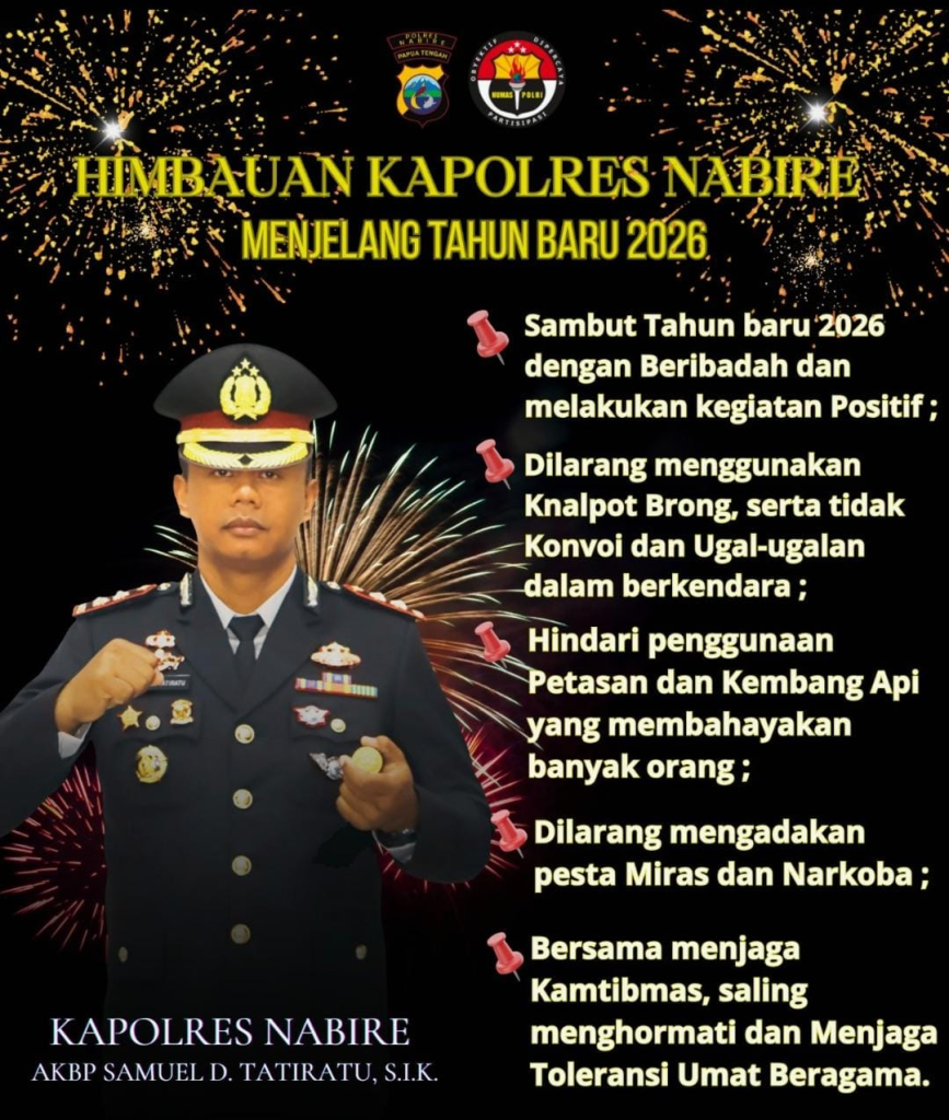 KABARPAPUA.CO, Nabire– Kepolisian Resor (Polres) Nabire bergerak cepat untuk memastikan wilayah hukumnya tetap kondusif. Selasa, 30 Desember 2025, Kapolres Nabire, AKBP Samuel D. Tatiratu mengeluarkan instruksi tegas bagi masyarakat yang hendak merayakan malam tahun baru.