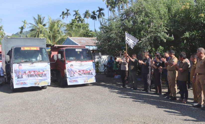 Kapolres Kepulauan Yapen AKBP Ardyan Ukie Hercahyo bersama jajaran forkopimda melepas truk pengangkut beras SPHP di Halaman Kantor Bulog Serui. (KabarPapua.co/Ainun Faathirjal)