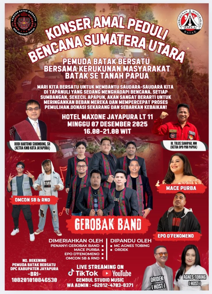 KABARPAPUA.CO, Kota Jayapura– Pemuda Batak Bersatu bersama Kerukunan Masyarakat Batak (KMB) Se-Tanah Papua menggelar konser amal bertajuk “Peduli Bencana Sumatera Utara. Kegiatan akan berlangsung di Hotel Max One Jayapura Kota Jayapura, Lantai 11, Minggu 7 Desember 2025.