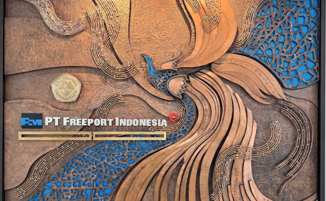 Pada bagian dalam auditorium menampilkan material tembaga sebagai visualisasi produk PTFI, dipadukan dengan motif alam Papua, serta ukiran Cenderawasih dan Kamoro yang memberi sentuhan khas dan harmonis.