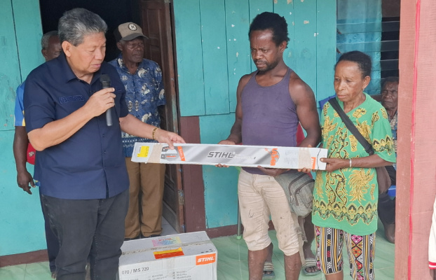 Penyerahan simbolis bantuan peralatan kebun bagi masyarakat. (KabarPapua.co/Ainun Faathirjal)