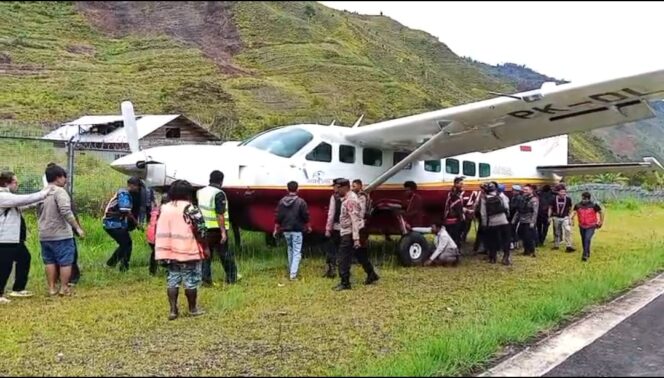 KABARPAPUA.CO, Mulia- Pesawat Alda Air dengan nomor registrasi PK-DLA mengalami pecah ban kanan saat mendarat di Bandara Mulia, Kabupaten Puncak Jaya, Provinsi Papua Tengah, Kamis 10 Juli 202, sekitar pukul 09.00 WIT.