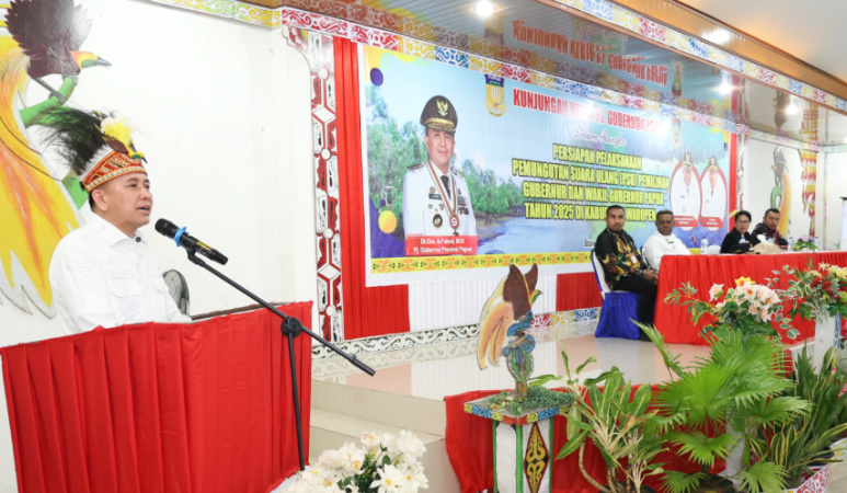 Pj Gubernur Papua Agus Fatoni saat memberikan sambutan saat kunker ke Kabupaten Waropen. (Foto dok: Diskominfo Papua)