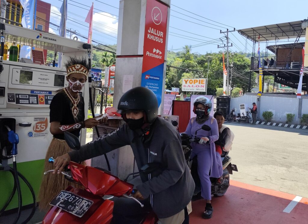 Pada momen ini, sejumlah operator SPBU bahkan menggunakan pakaian adat Papua lengkap dengan aksesorisnya.